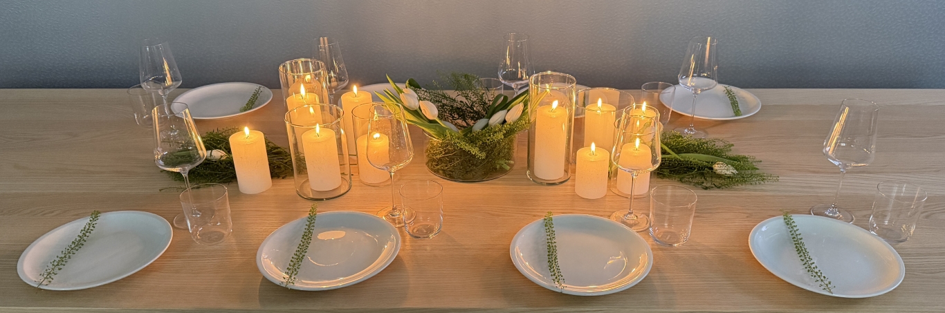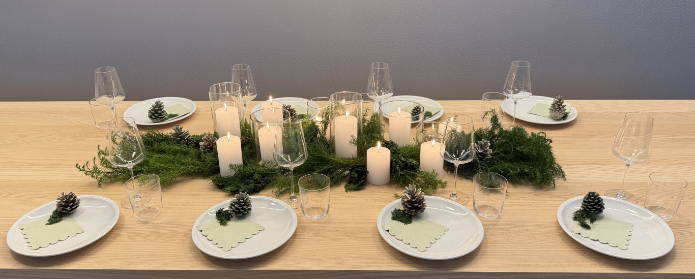 Klassische Tischdekoration mit winterlichem Grün, Kerzen und edlem Glas